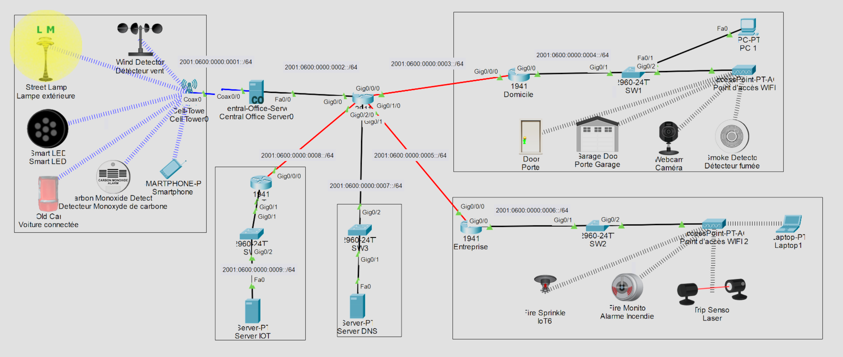 J'ai pu concevoir un projet autour d'une Smart City à l'aide de l'outil Cisco Packet Tracer. Cette initiative vise à explorer divers aspects des réseaux informatiques tout en mettant en œuvre des technologies pour créer un environnement urbain intelligent. Les objectifs fixés comprennent la maîtrise de l'adressage IPv6, la compréhension de protocoles tels que OSPF, la manipulation des IoT, l'intégration du réseau IPv6 avec des tours cellulaires (3G/4G)...